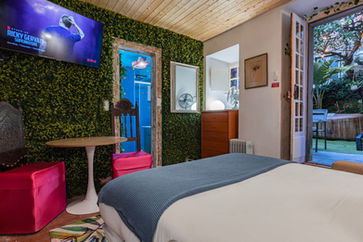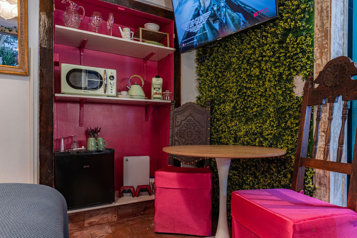 The tiny house and garden are entirely private for you, with a private entrance door directly from the historic streets of Sintra! Simply input the code, and voila, you're in. It's incredibly cozy with a funky decor! But, please understand, it's a magical tiny studio with one bedroom and a "semi-kitchen" included, equipped with a coffee machine, microwave, kettle, mini-fridge, all the cutlery, plates, glasses, and a delightfully quirky bathroom featuring a pink guitar chandelier, hundreds of yellow ducks, and Smart Speaker for you to converse with, commanding it to change the light colors or play your favorite Musics while you enjoy a hot shower! The bed is queen-sized, comfortable, with four pillows, perfect for two people to have a nice relaxing night after a day of Exploring Sintra. Especially considering the prime location! Indoors, you have free Netflix, HBO Max, Prime Video and Disney Plus already logged in, you'll also find a PS5, with PlayStation PLUS premium account with SEVERAL games already installed a flat 4K TV screen, and colorful lights that you can change by asking it with voice commands. Undoubtedly, the best part of the tiny studio is the garden filled with herbs and trees, three giant disco balls hanging, and a fantastic outdoor movie projector for you to enjoy even while relaxing in the jacuzzi! The outdoor couch is spacious, and you also have a hammock to unwind in, as well as a superb stone BBQ to utilize, complete with a sink on the side.
